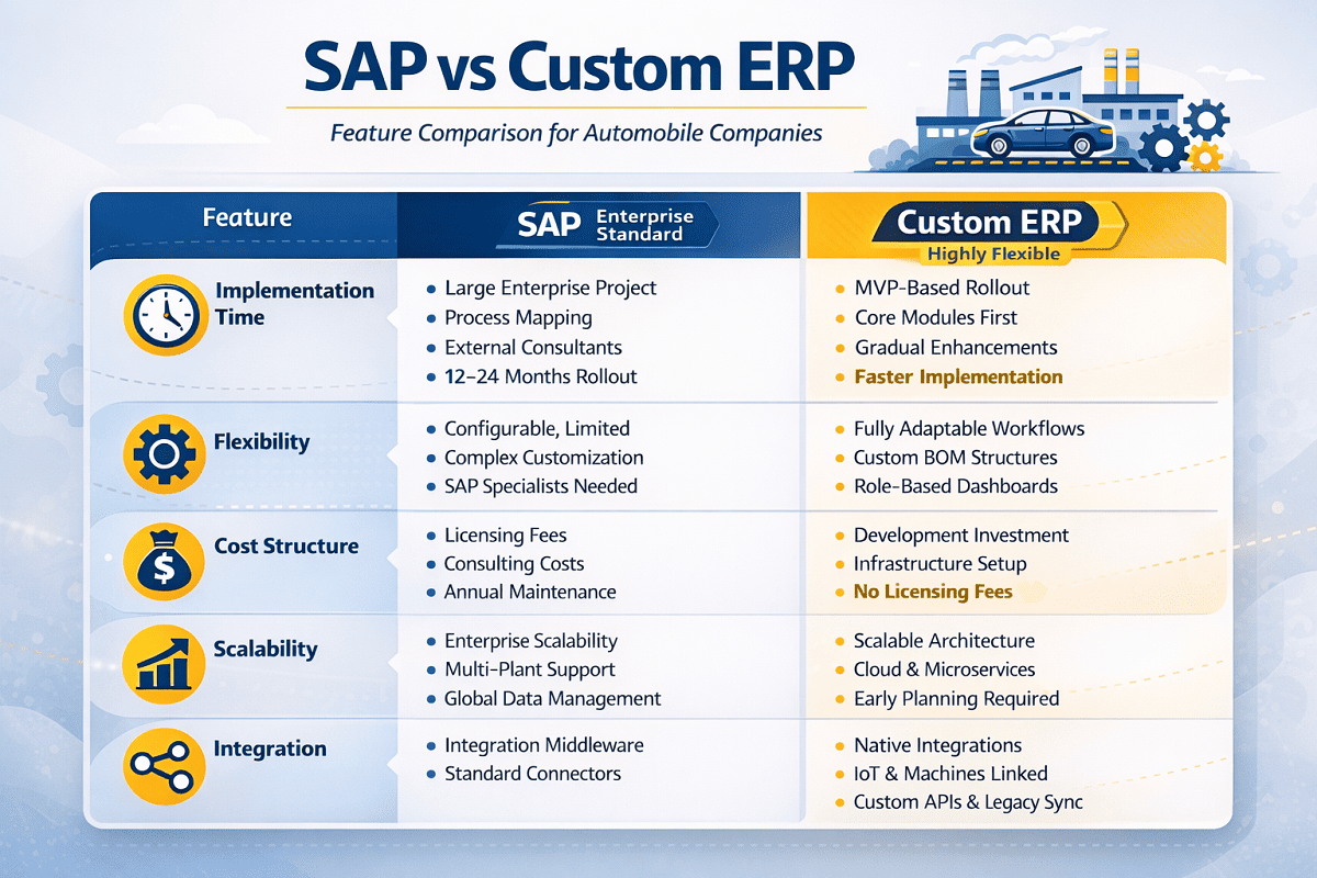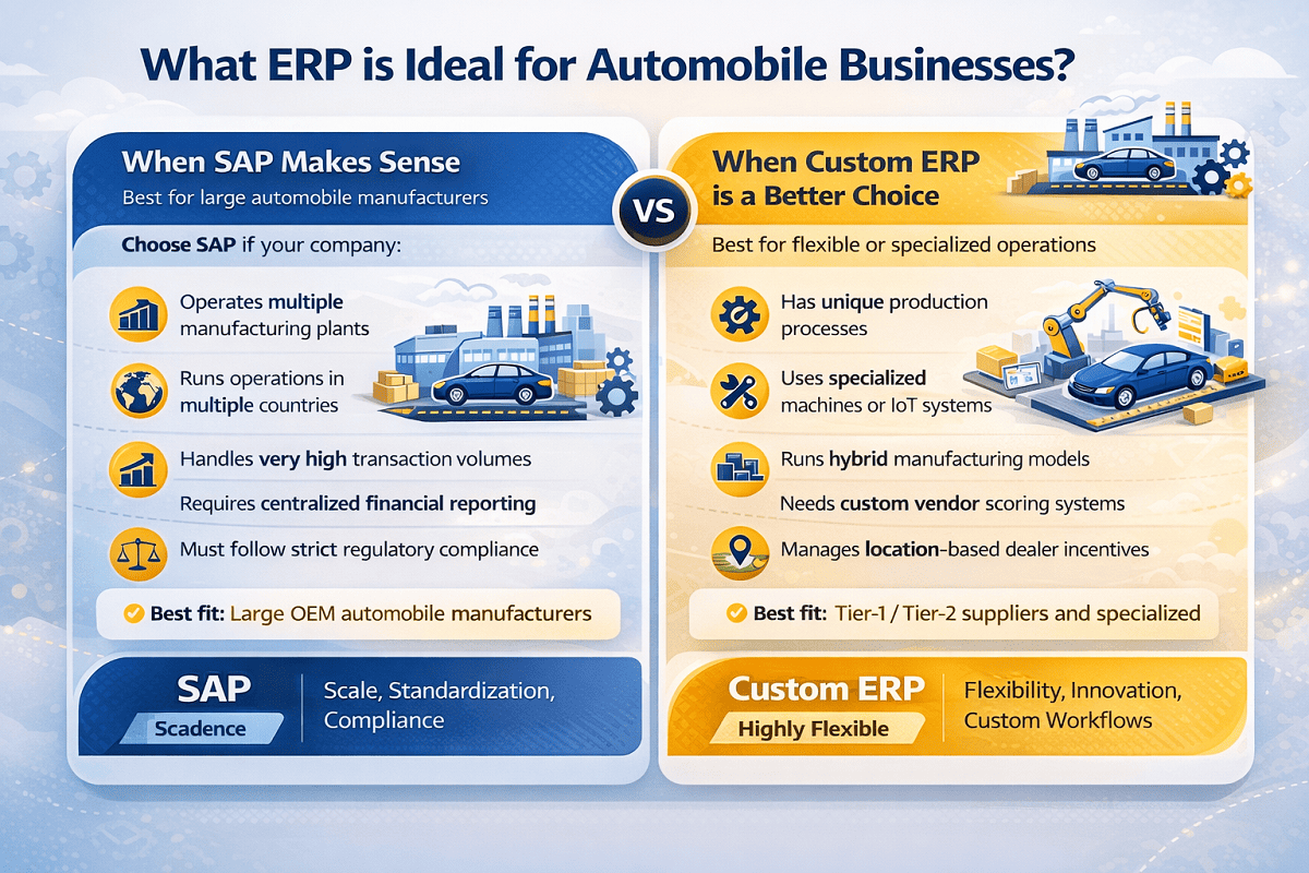 Confused between SAP and Custom ERP? A practical comparison for automobile companies focused on scalability, cost, and long-term growth.